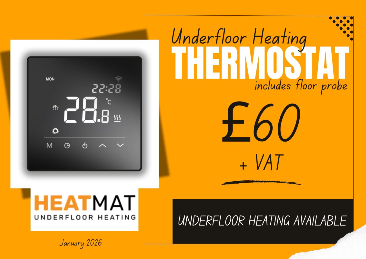 Heat Mat underfloor heating thermostat available from us. Floor probe is included. We are currently selling these for £60+vat. Underfloor heating is also available from us.
